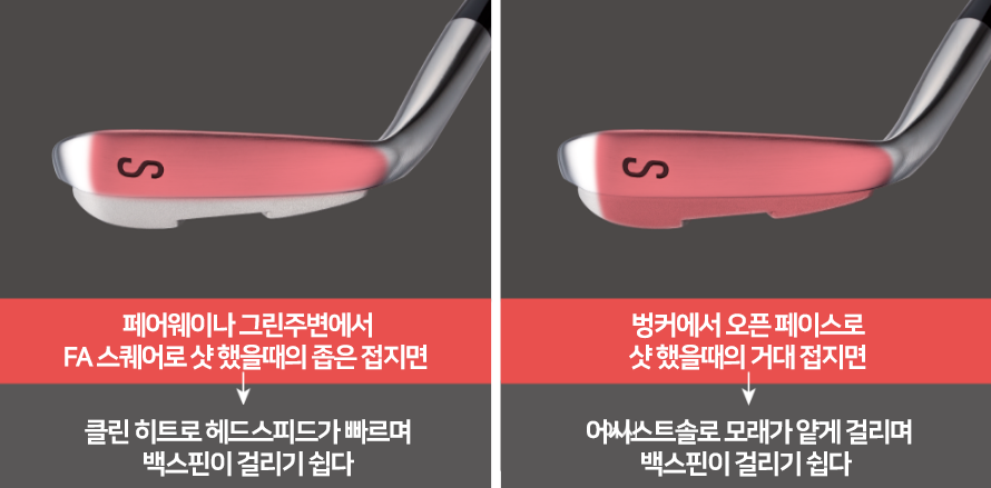 페어웨이 등 부드러운 라이에서는 폭이 좁은 솔로 샤프한 타격을 실현. 더프샷인 경우나 페어웨이 벙커에서는 헤드가 깊이 박히지 않도록 어시스트 솔의 『초광폭 솔』효과가 발휘됩니다. 비거리 손실이나 과도한 헤드턴을 억제하여 미스샷을 최소화하여 스코어 향상에 크게 기여합니다. 이제 벙커는 페이스를 열고 더프샷만으로도 해결할 수 있습니다!