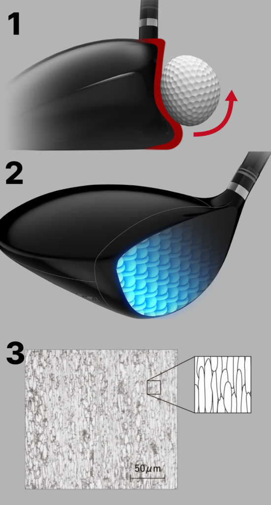 임팩트 시 페이스가 수축하면 페이스의 세로 방향에서 로프트에 의해 위쪽으로 마찰이 발생하여 백스핀 양이 증가하는데, 만약 세로 방향으로의 수축을 억제할 수 있다면 백스핀 양의 증가를 최소화하면서 볼의 초속을 높일 수 있습니다.